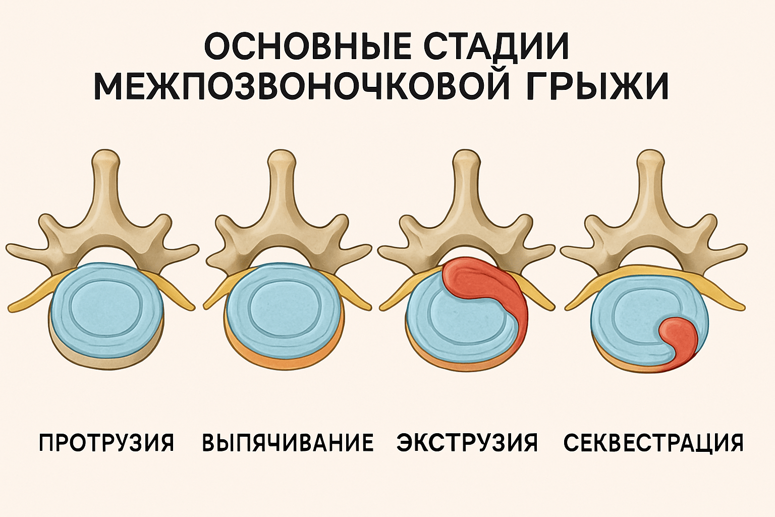 Выделяют 4 основных стадии межпозвонковой грыжи: